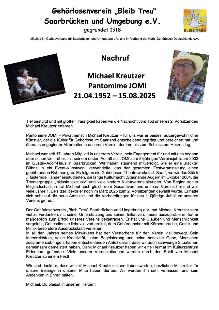 Der Gehörlosenverein "Bleib Treu" Saarbrücken und Umgebung e.V. ist ein Verein für Menschen mit Hörbehinderung. Wir unterstützen unsere Mitglieder mit Rat und Tat in sozialer, seelsorgerischer und kultureller Hinsicht und verbinden auf Wunsch den Kontakt zur Kath. Gehörlosengemeinde des Bistums Trier.